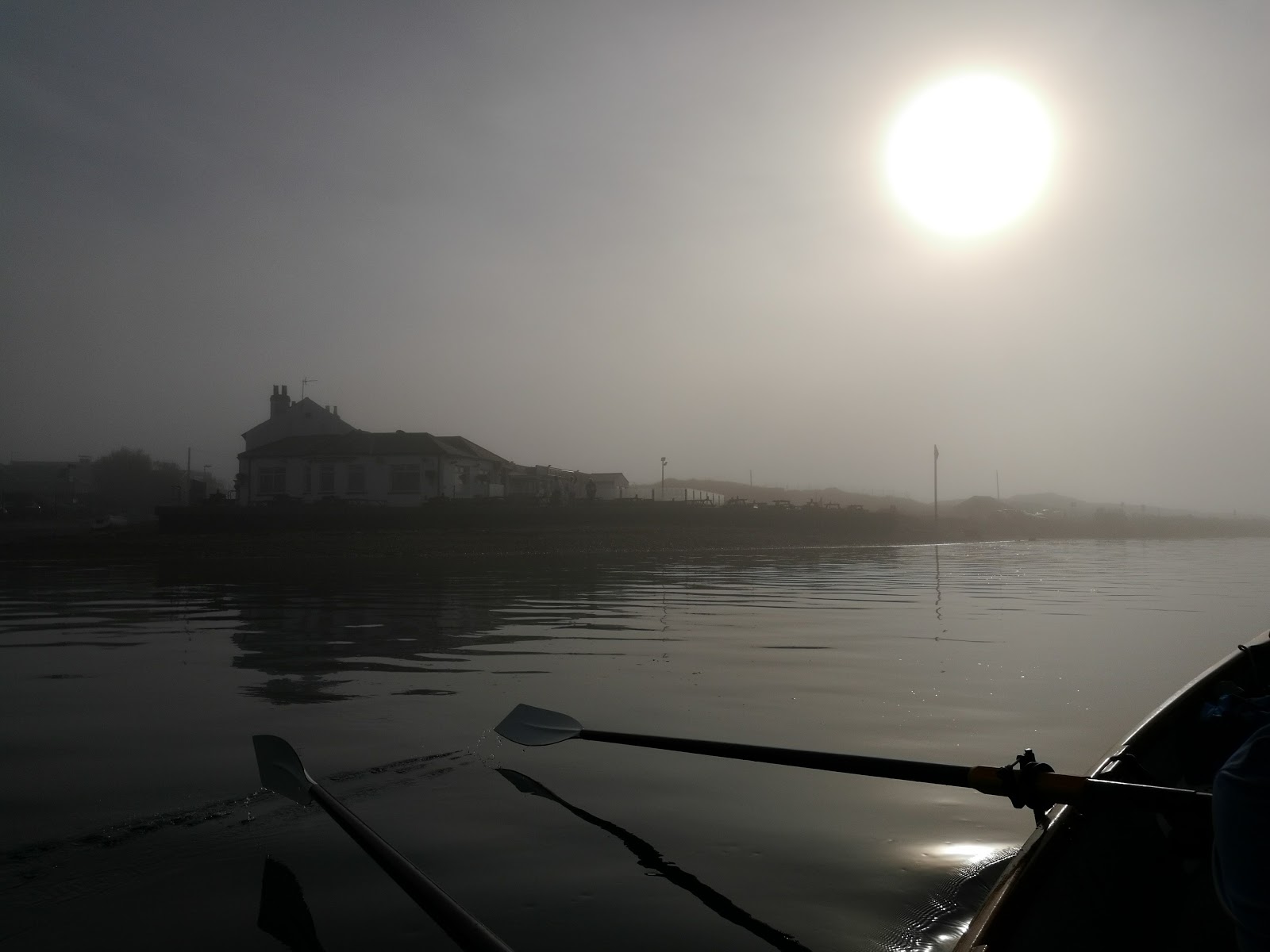 I got fed up sitting there going nowhere so I took to the oars (picture: Tom). Then I felt a breath of wind and put the sail back up again, whereupon it died. This happened about a million times before I got fed up with that too and decided to get stuck in and row back. From Hythe to Warsash. Snarleyow is quite heavy but under oars she was faster than all the sailors.